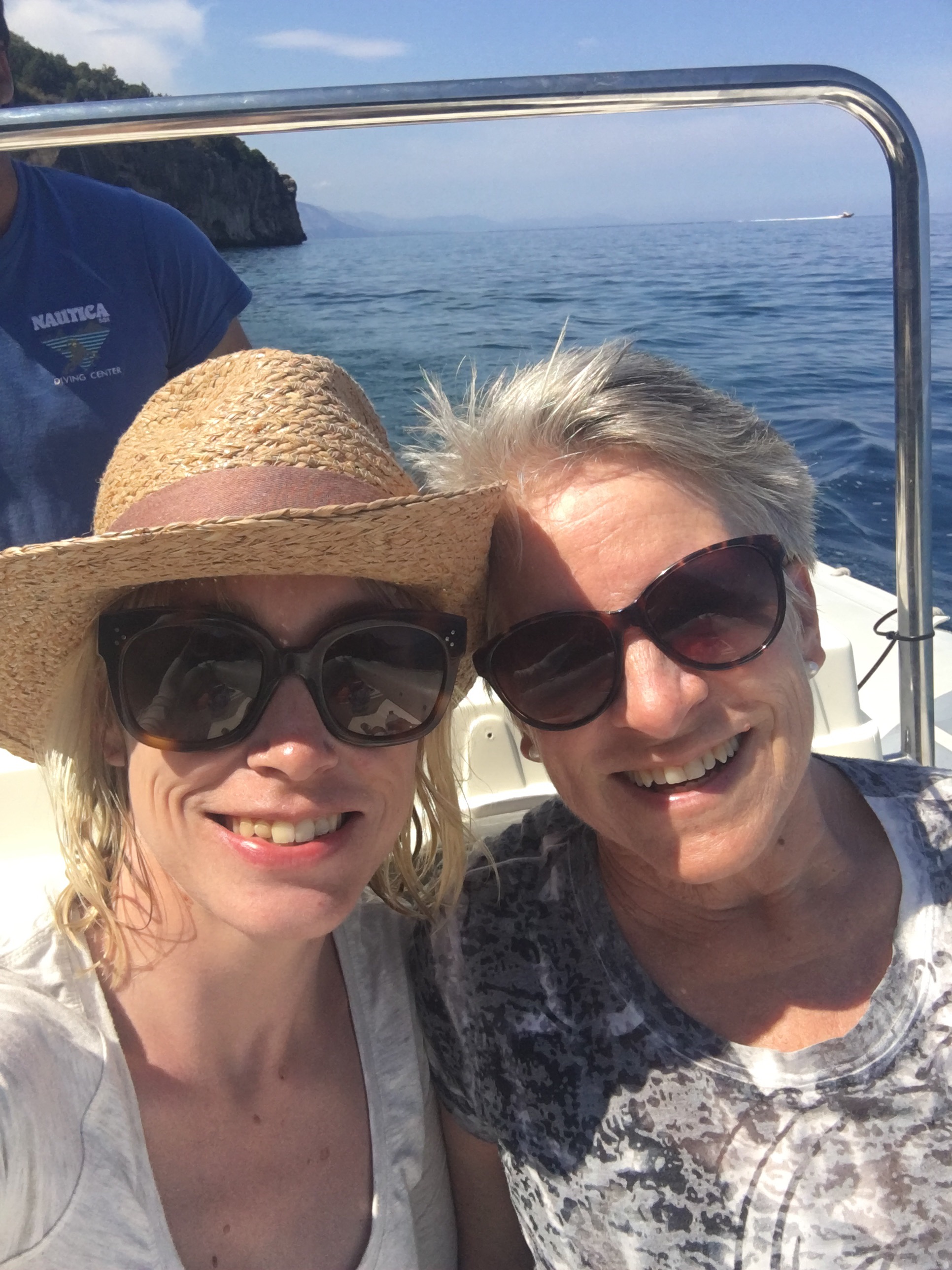 As my daughter Laurel said, it felt like we were in a movie set!  The distinct advantage of being on the water hugging the coast the whole way is that the perspective is perfect. The mountains soar straight up from the azure blue Mediterranean speckled with old fortresses, caves, deep crevasses and occasionally a beautiful melon coloured village with its cupola signalling the centre would pop up nestled at the base.  Positano was one such village.